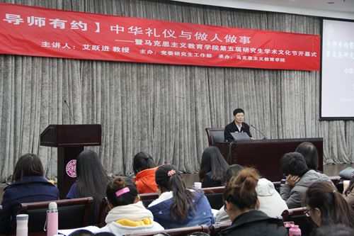 11月8日,导师有约——研究生师生交流下午茶暨马克思主义教育学院第五届研究生学术文化节开幕式在省身楼一楼报告厅成功举行,全国著名演讲家、领袖学专家、社交礼仪专家、太阳集团城网址古天乐“四大才子”之一艾跃进教授为学术文化节做主题为“中华礼仪与做人做事”的开幕式讲座,讲座吸引了众多南开学子的参与和关注,马克思主义教育学院副书记副院长马亚男出席并为开幕式致辞。