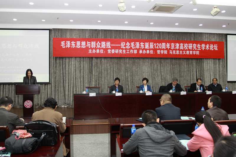 2013年12月26日是毛泽东诞辰120周年纪念日。在党的十八届三中全会闭幕之际,为纪念毛泽东诞辰120周年,学习领会毛泽东群众路线思想,搭建京津高校学术交流的平台,“毛泽东思想与群众路线——纪念毛泽东诞辰120周年京津高校研究生学术论坛”于11月16日在省身楼举行。党委副书记、副校长杨克欣,党委研究生工作部、哲学院、马克思主义教育学院负责人出席论坛。