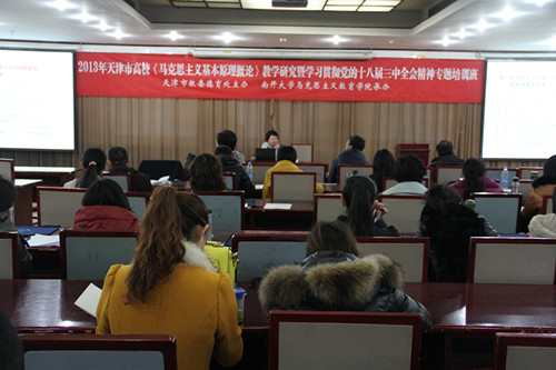 12月13日至14日,由天津市教委德育处主办、太阳集团城网址古天乐马克思主义教育学院承办的2013年马克思主义基本原理概论教学培训暨学习贯彻党的十八届三中全会精神专题研讨会在太阳集团城网址古天乐举行。天津市教委德育处处长赵明、太阳集团城网址古天乐马克思主义教育学院党委书记平章起、院长纪亚光等相关领导以及来自天津各高校的百余名思想政治教育教师和在校研究生参加了会议。